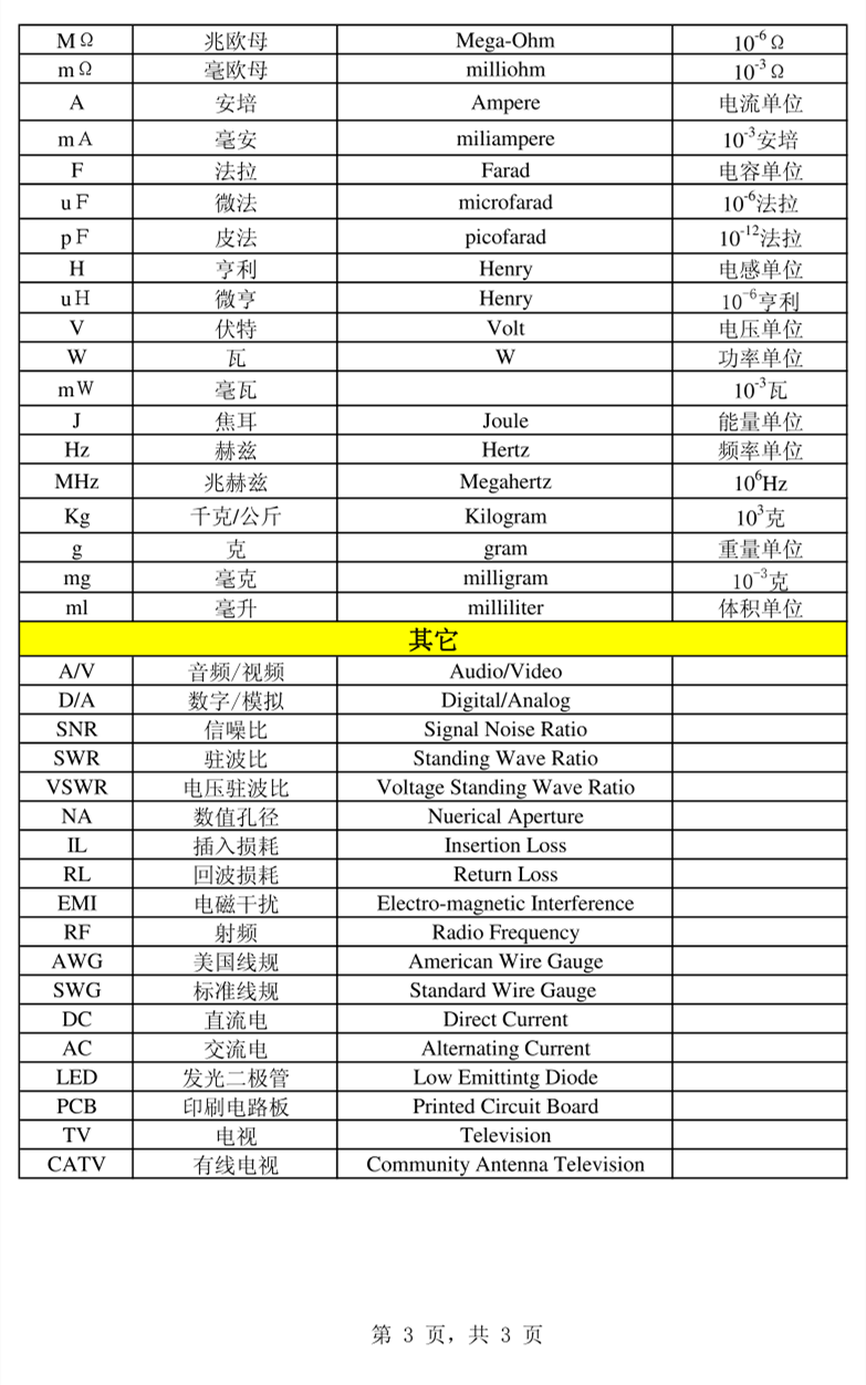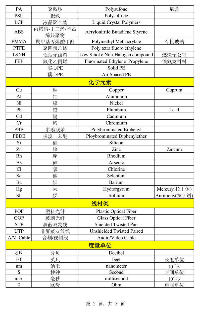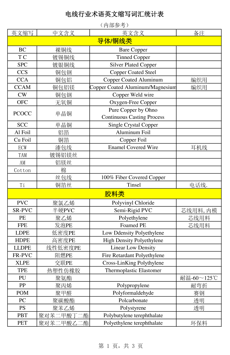 电线行业术语英文缩写词汇统计表